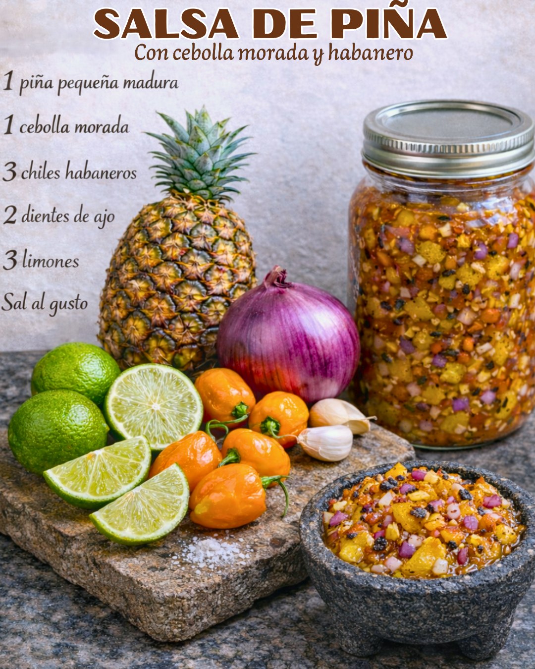 Ingredientes * 1 piña pequeña madura (cortar en cubos) * 1 cebolla morada pequeña picada finamente * 3 chiles habanero (o al gusto) * 2 dientes de ajo * Sal al gusto * Jugo de 3 limones pequeños o al gusto